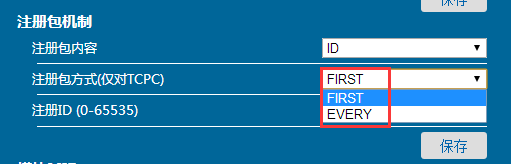 發(fā)送方式:設(shè)置為FIRST時,模塊連接到服務(wù)器后只發(fā)送一次ID或者MAC。設(shè)置為 EVERY時,每個數(shù)據(jù)包前邊帶有ID或者MAC地址。