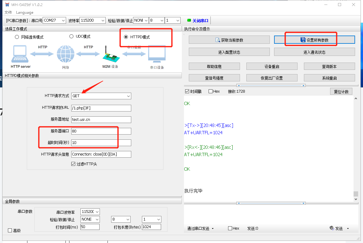 2、點擊HTTPD模式,配置服務器的信息。設置HTTP請求方式為GET,HTTP服務器地址:test.usr.cn, HTTP服務器端口號為80,HTTP報頭路徑為/1.php?,設置完成后點擊設置并保存所有參數(shù)。最后點擊進入通訊狀態(tài)。