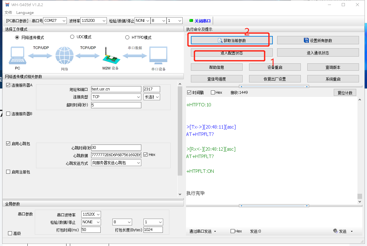 1、下載并安裝設備的設置軟件,在電腦的設備管理器中查看電腦端生成的com口(com27),在設置軟件中打開對應的com口,使用設備的默認串口參數(shù)(115200 N 8 1)進入產(chǎn)品的配置界面并且獲取當前參數(shù)。