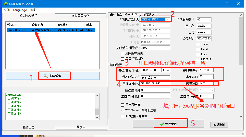 需要把S1模塊的ip改成DHCP獲取,或者改成與交換機(jī)同網(wǎng)段的靜態(tài)ip。把串口參數(shù)、ip端口填好后,點(diǎn)擊保存參數(shù),才能生效。