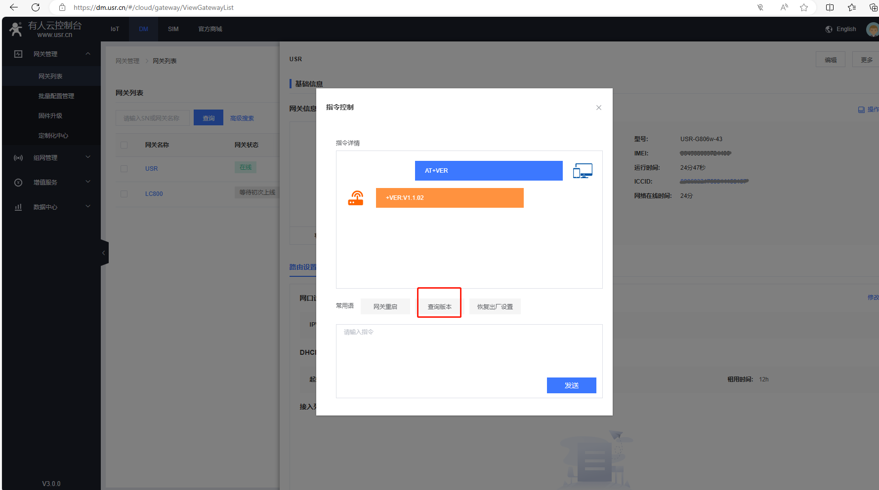 也可以在指令控制彈框,發(fā)送AT+VER,去查詢固件版本號。