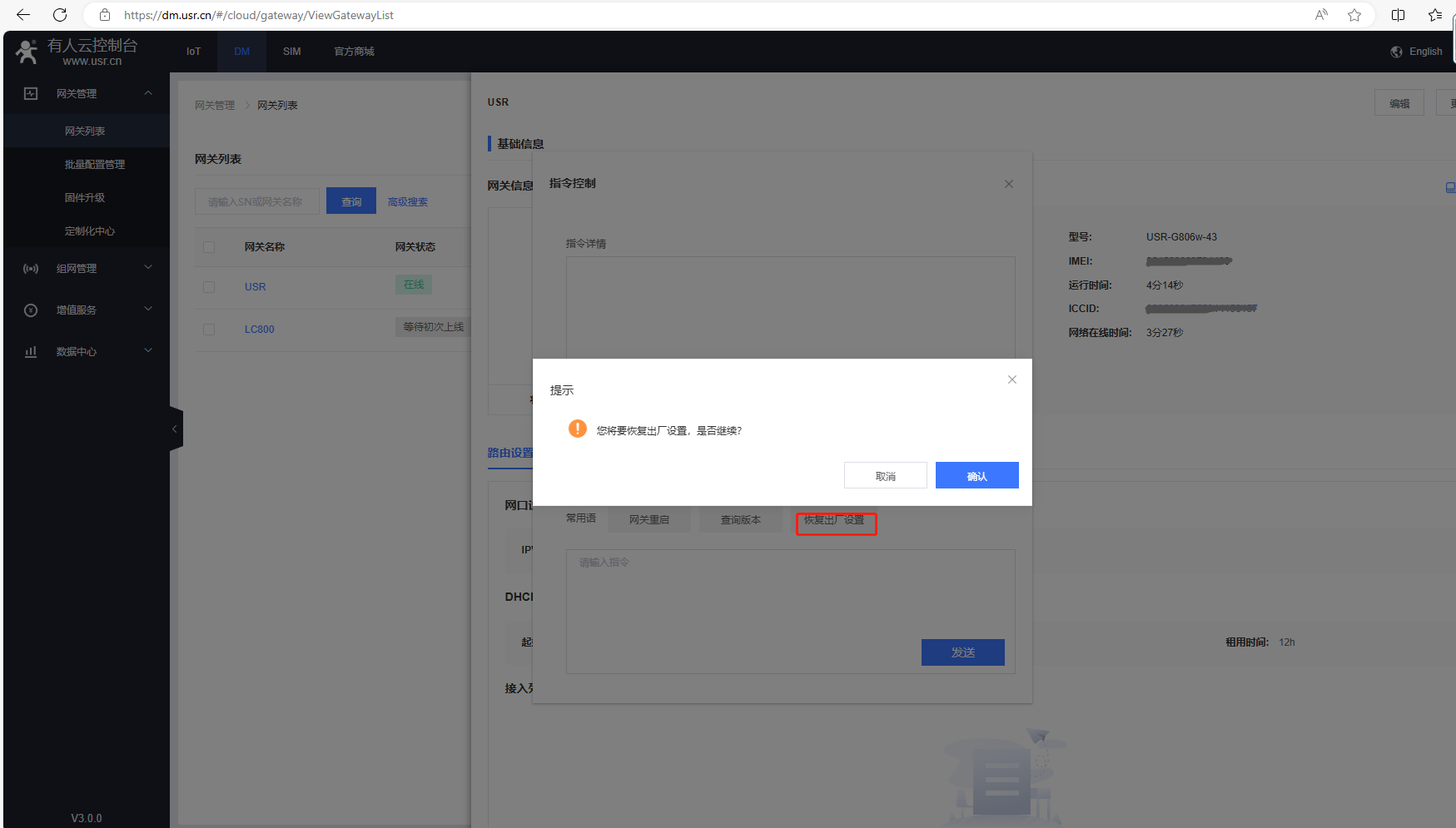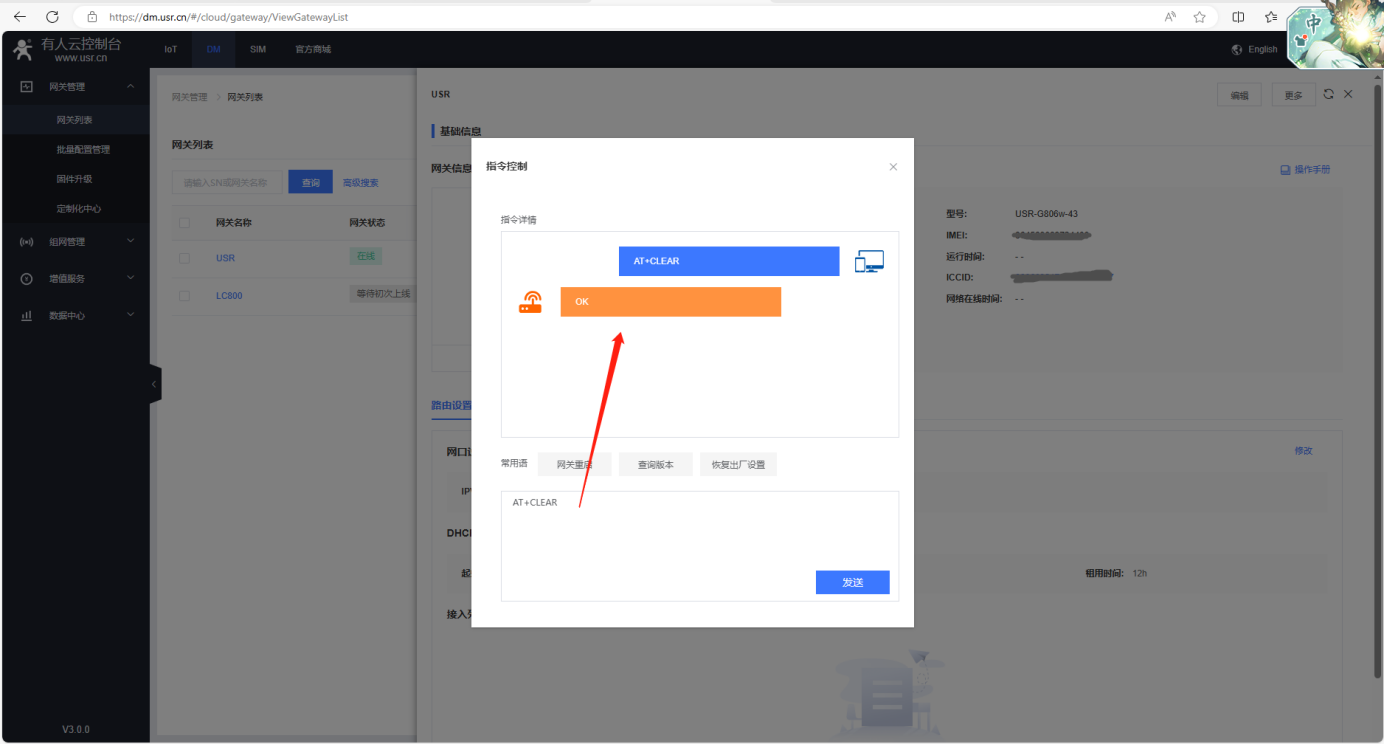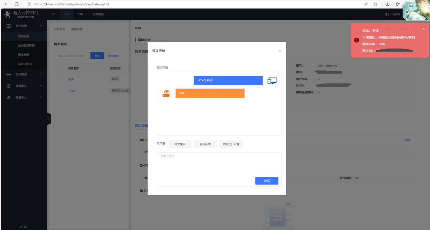 (1)在指令控制彈框,發(fā)送AT+R重啟USR-G806w的AT指令,網(wǎng)關(guān)重啟。