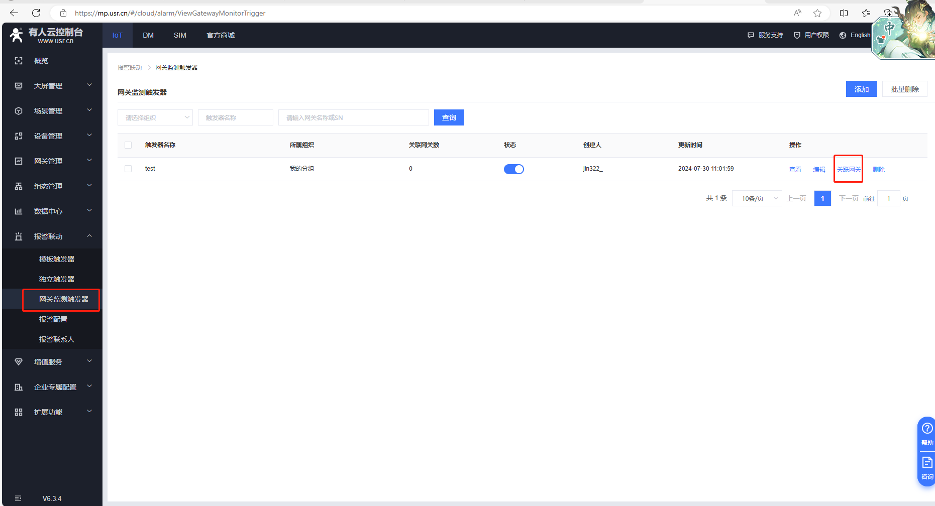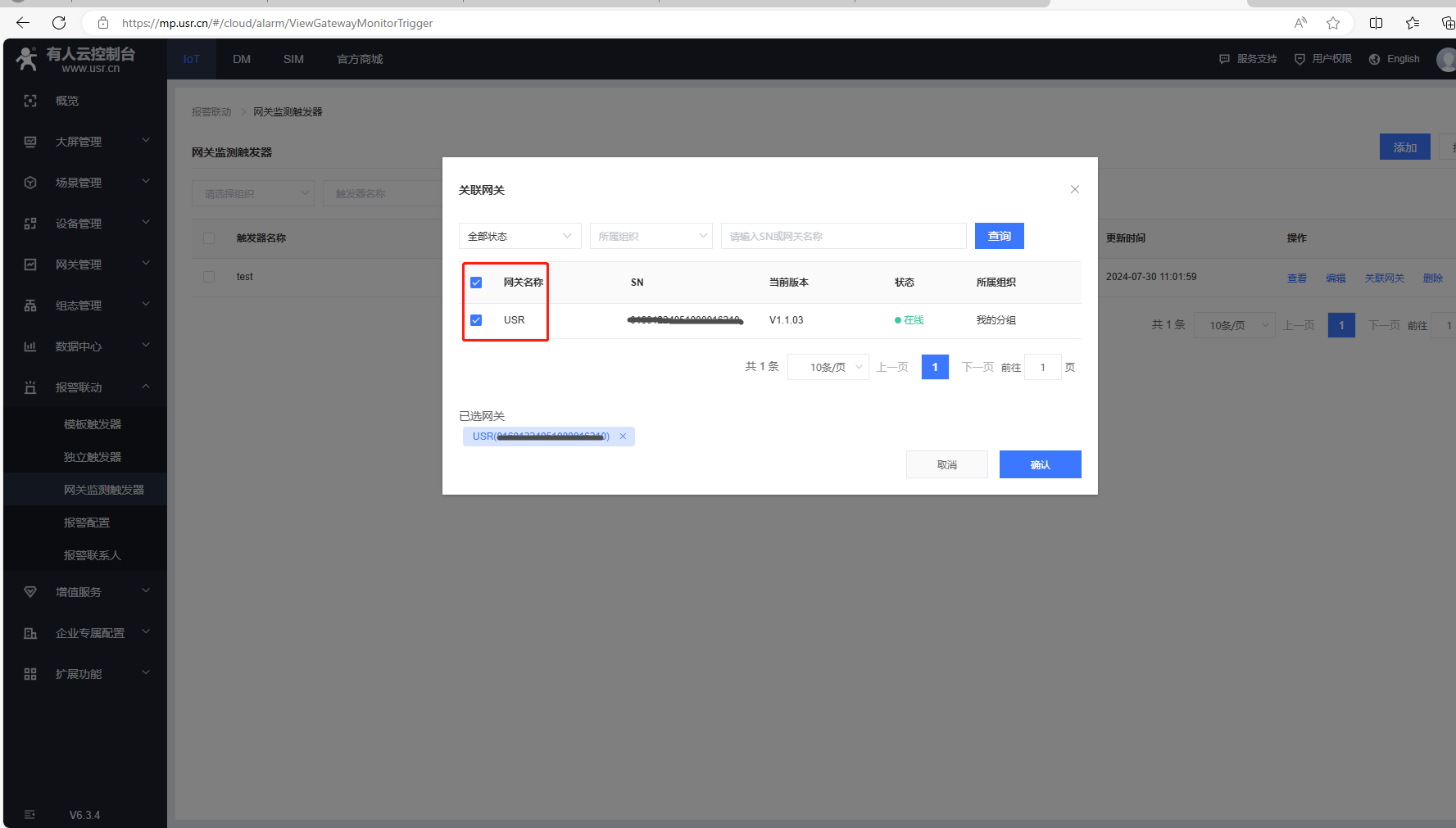 (2)IOT平臺,點擊報警聯(lián)動,點擊網(wǎng)關(guān)監(jiān)測觸發(fā)器,點擊關(guān)聯(lián)網(wǎng)關(guān)。勾選路由器網(wǎng)關(guān),點擊確認。