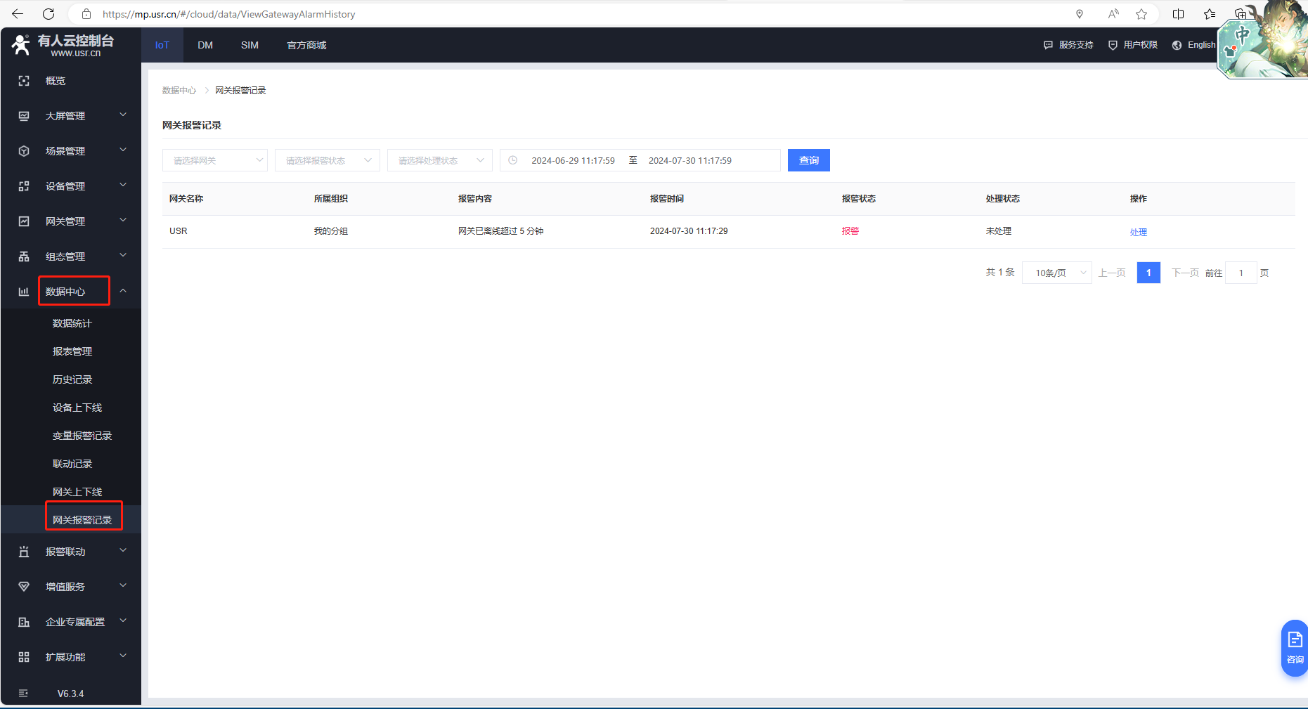 (4)IOT平臺,點擊數(shù)據(jù)中心,點擊網(wǎng)關(guān)報警記錄,可以查看網(wǎng)關(guān)報警記錄,報警狀態(tài)和處理狀態(tài)。
