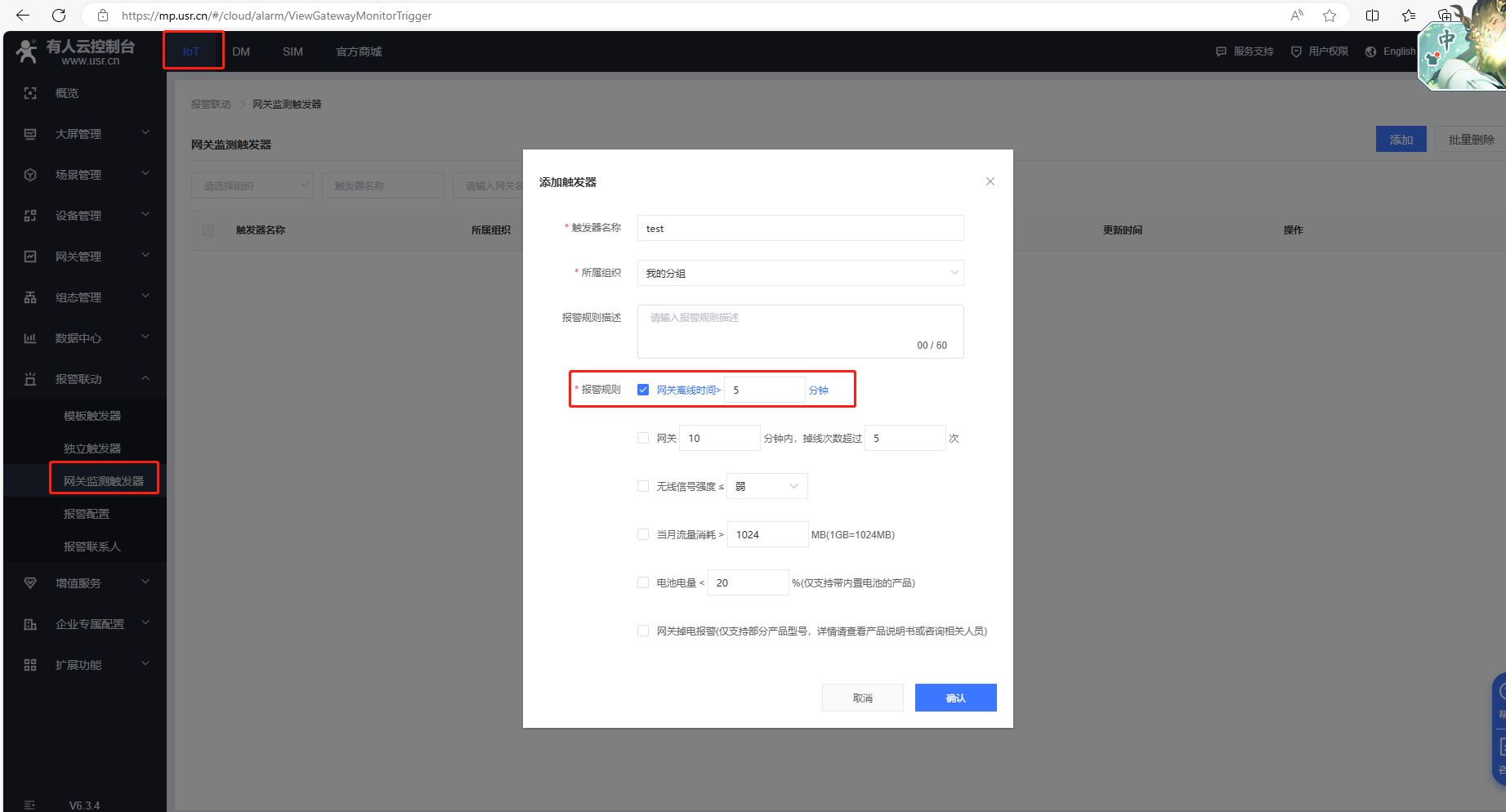 (1)IOT平臺,點擊報警聯(lián)動,點擊網(wǎng)關(guān)監(jiān)測觸發(fā)器,點擊添加,按照實際需要,設置報警規(guī)則,舉例,這里設置的是網(wǎng)關(guān)離線時間大于5分鐘,報警。