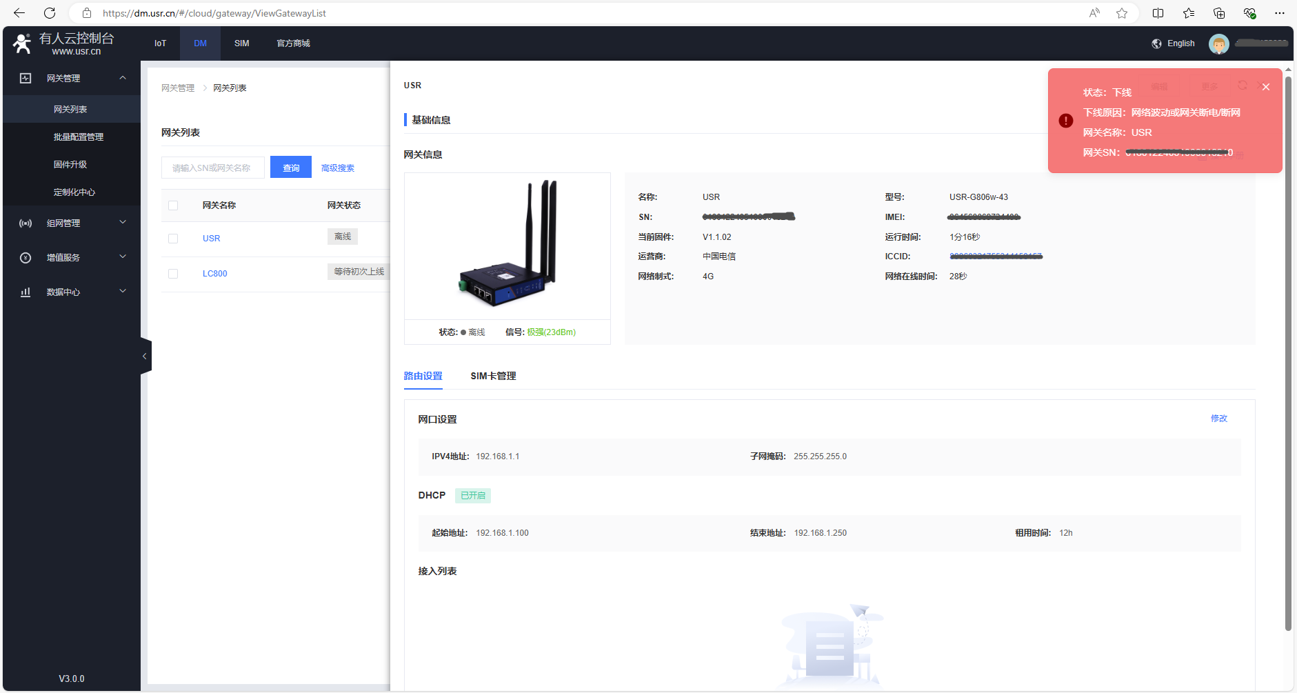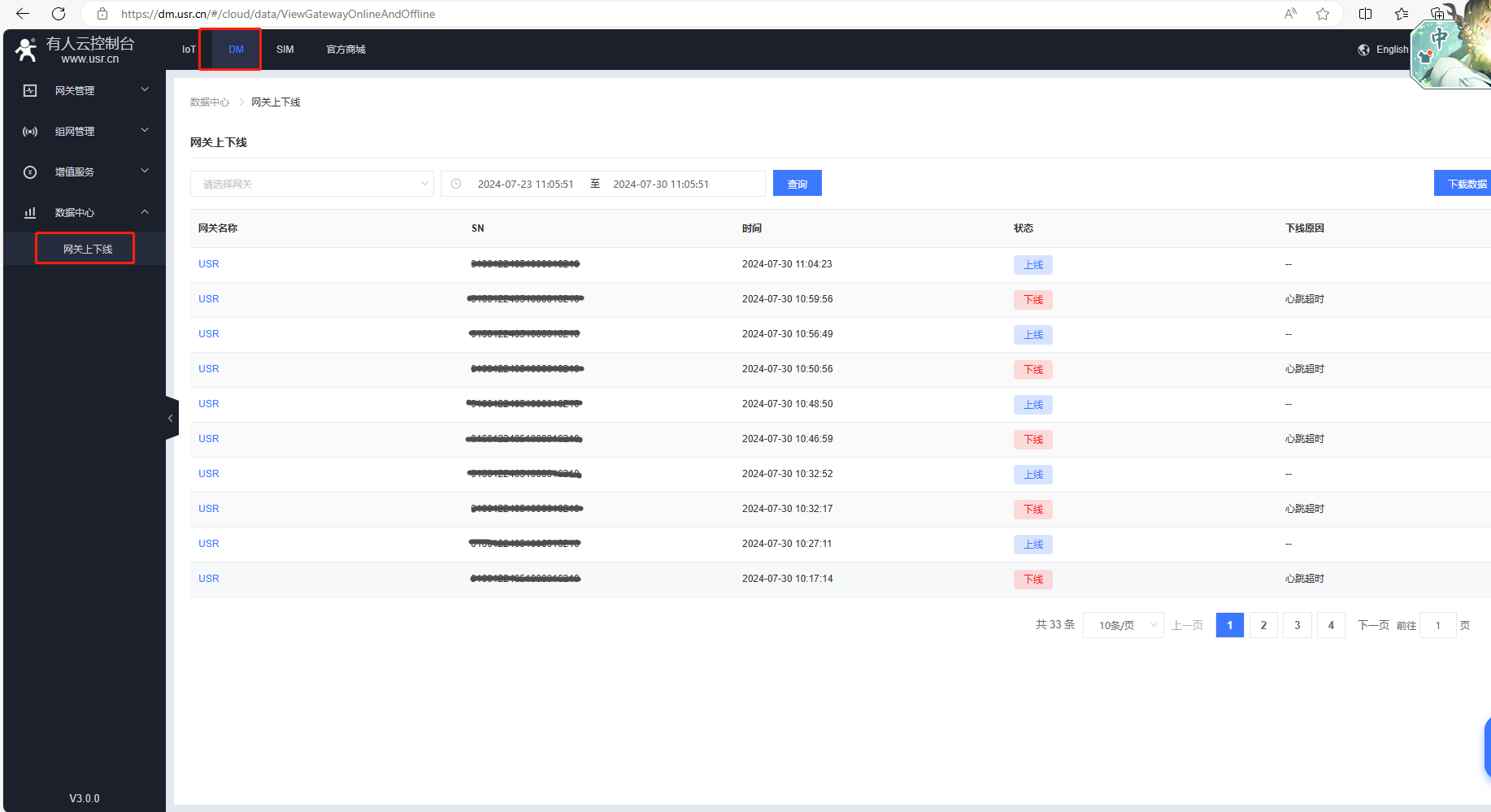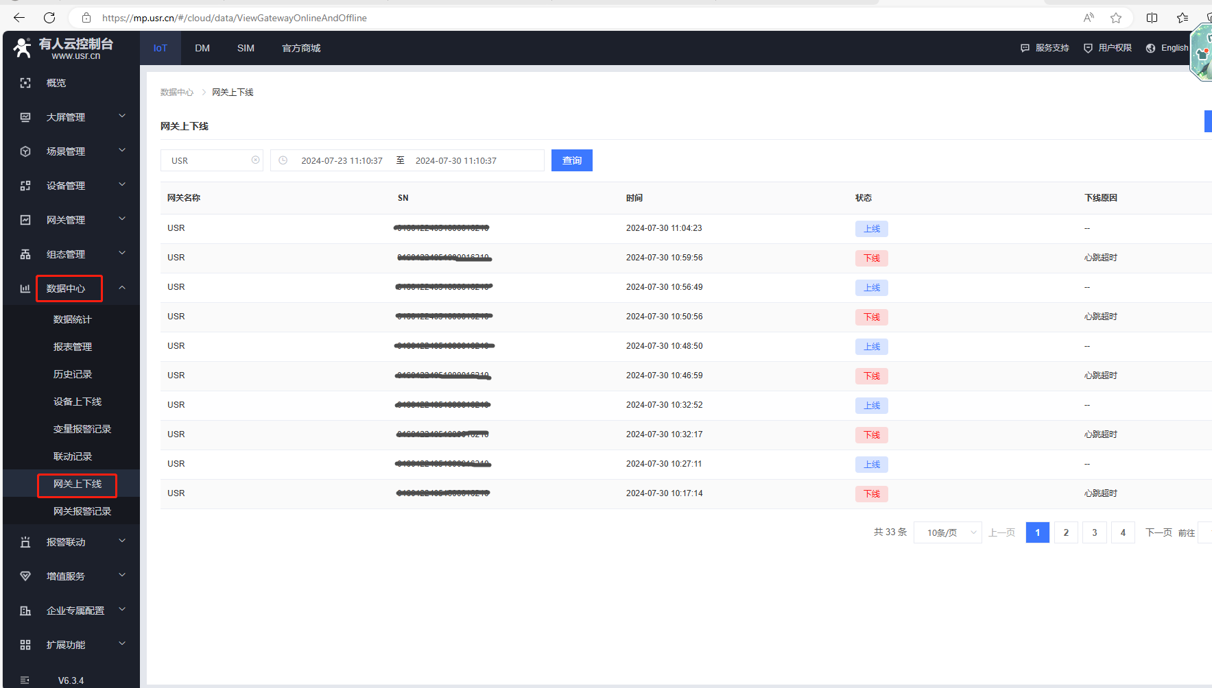 (1)DM平臺,點擊數(shù)據(jù)中心,點擊網(wǎng)關(guān)上下線可以查看網(wǎng)關(guān)的上下線記錄。