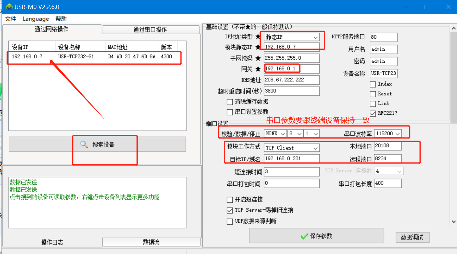 將軟件串口設(shè)置中的串口號配置為COM9。由于設(shè)備默認協(xié)議類型為TCP client,所以電腦端需要設(shè)置為TCP server, IP和端口號為模塊的目標IP:192.168.0.201和目標端口號:8234。 顯示連接對象,證明連接成功。此時從串口助手(com9)發(fā)送數(shù)據(jù),網(wǎng)絡(luò)助手可以收到;從網(wǎng)絡(luò)助手發(fā)數(shù)據(jù),串口助手也能收到。