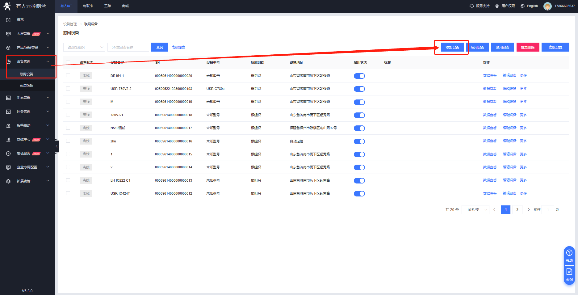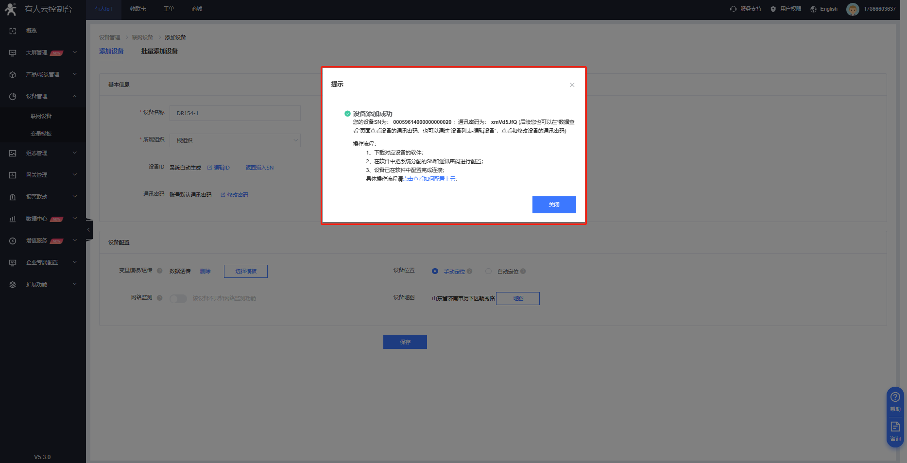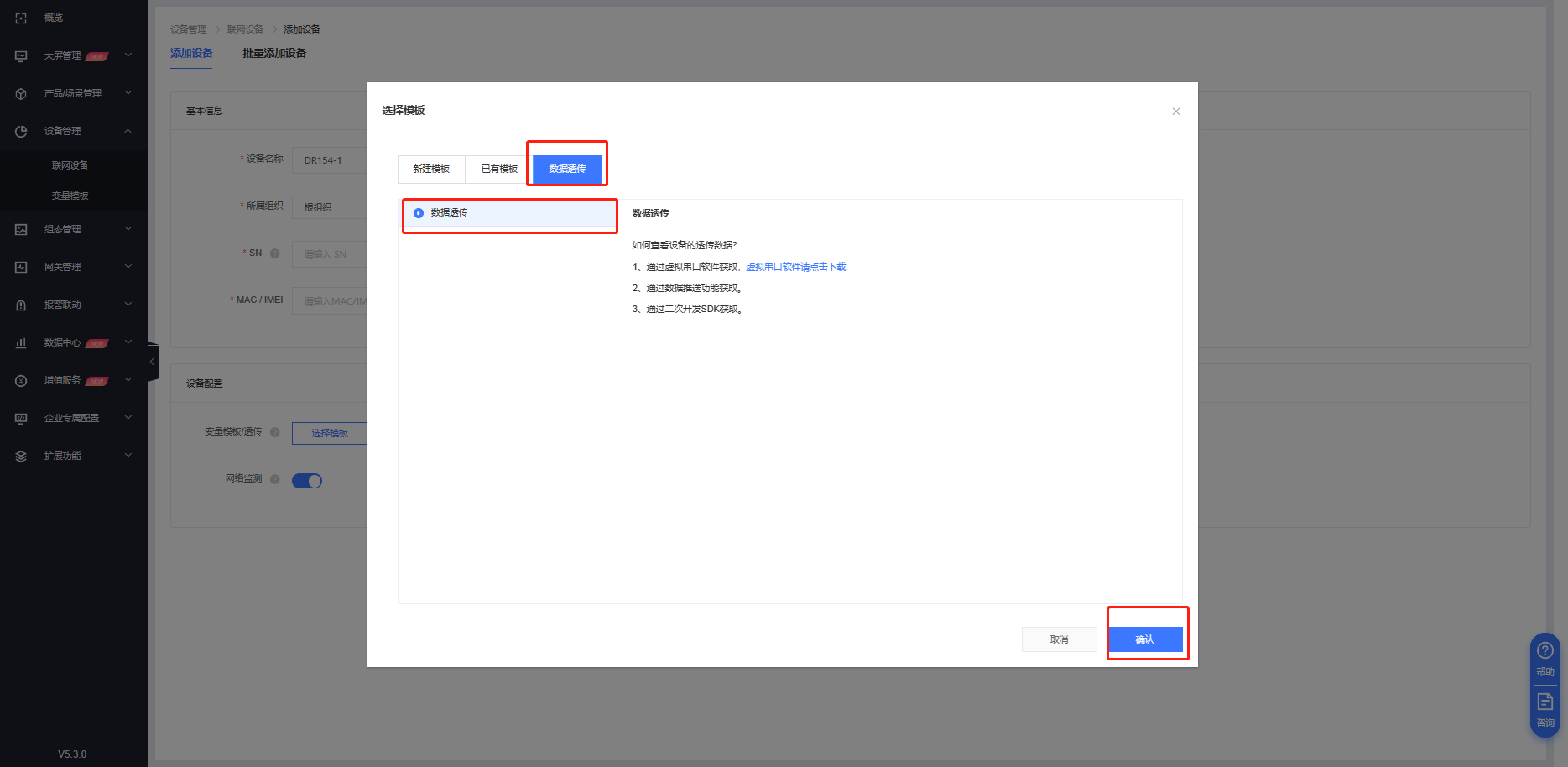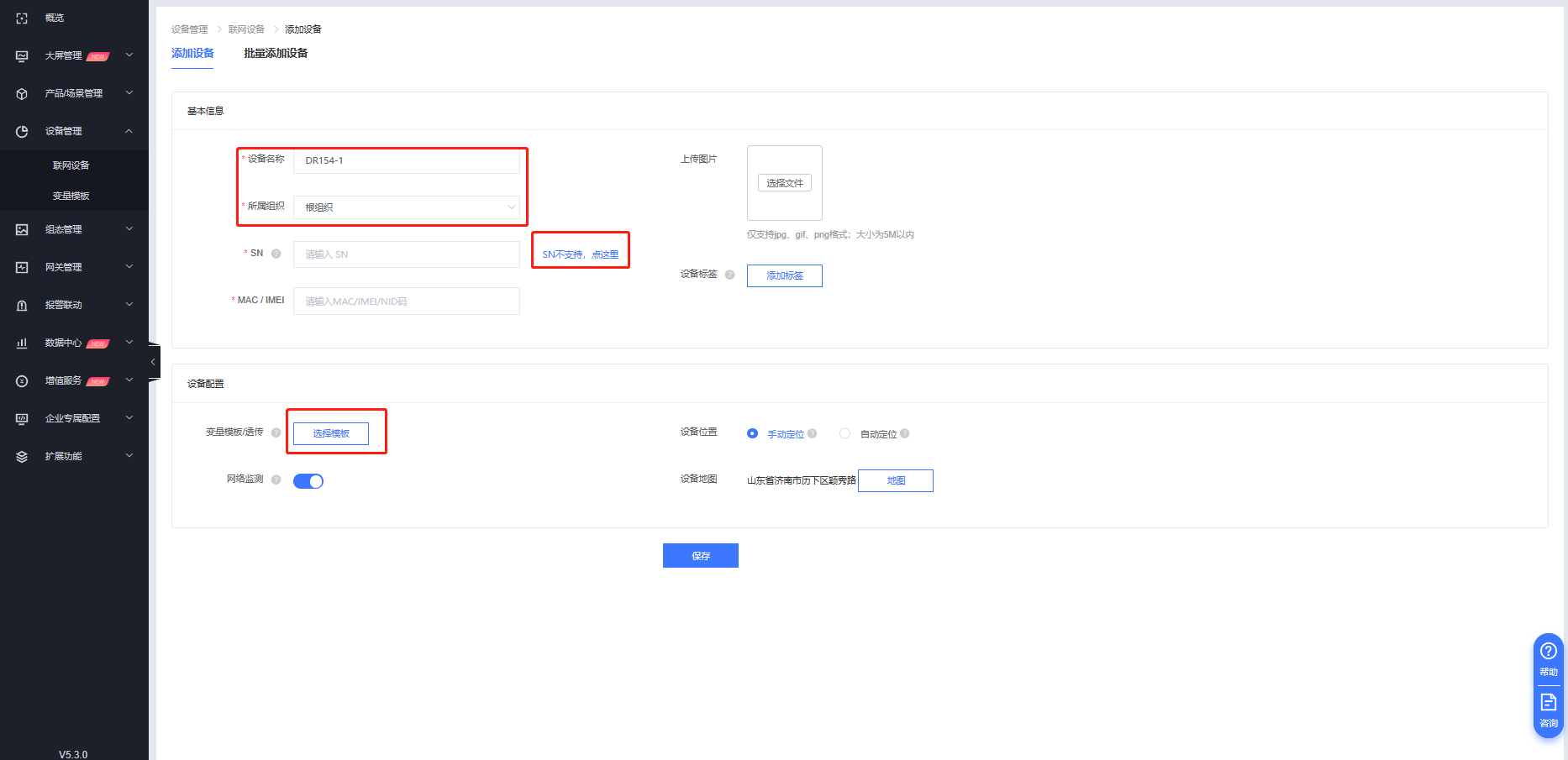 1. 登錄有人云-設(shè)備管理-聯(lián)網(wǎng)設(shè)備-添加設(shè)備,填寫設(shè)備名稱,選擇設(shè)備組織,選擇“SN不支持,點這里”,模板選擇透傳模板。