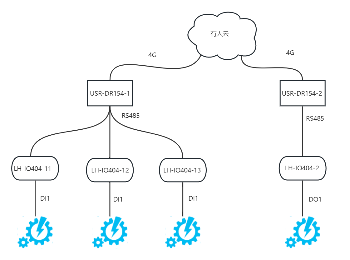 (1) 將標(biāo)號為LH-IO404-11, LH-IO404-12, LH-IO404-13的三臺串口繼電器和USR-DR154-1通過485接線并接在一起