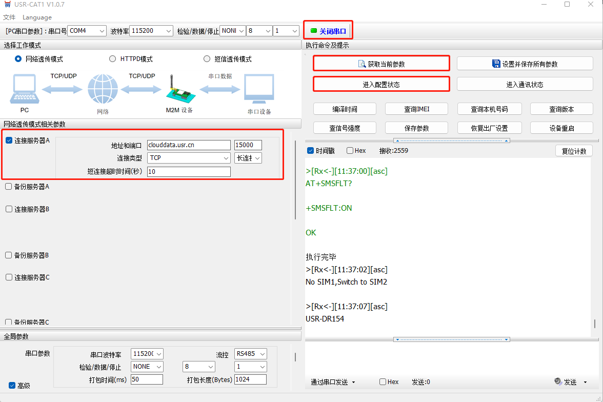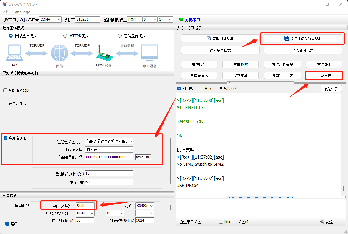 2. USR-DR154通過USB轉(zhuǎn)485轉(zhuǎn)化器接到電腦上,使用上位機(jī)軟件將波特率修改至9600;服務(wù)器IP修改為clouddata.usr.cn和端口號修改為15000;注冊包選擇有人云,填寫云平臺分配的SN和通訊密碼;其他參數(shù)不變。設(shè)備重啟后即可在有人云上看到設(shè)備上線,兩臺USR-DR154均按照步驟1 2設(shè)置.給USR-DR154標(biāo)號為USR-DR154-1,USR-DR154-2.