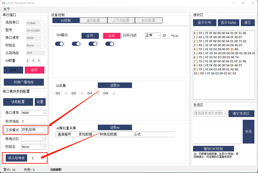 4. LH-IO404通過USB轉(zhuǎn)485轉(zhuǎn)換器接到電腦上,打開LH-IO404的上位機(jī),測試?yán)^電器是否能正??刂疲⒗^電器的工作模式設(shè)置成雙機(jī)非鎖模式,設(shè)備地址默認(rèn)為1 ,4臺LH-IO404均為此設(shè)置。給LH-IO404標(biāo)號為LH-IO404-11, LH-IO404-12, LH-IO404-13, LH-IO404-2