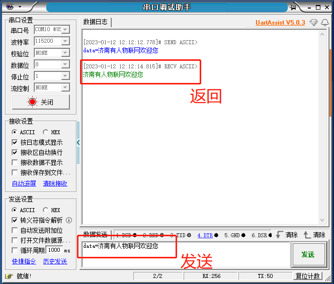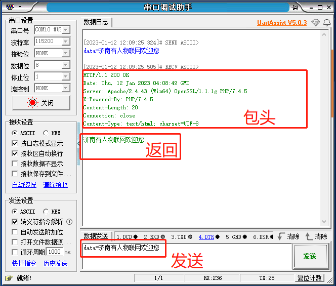5.按照data=的格式從串口發(fā)送data=濟(jì)南有人物聯(lián)網(wǎng)歡迎您,會(huì)看到服務(wù)器返回的報(bào)頭和數(shù)據(jù)。