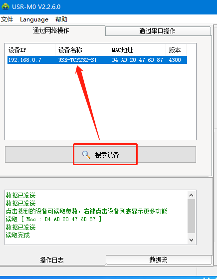 3. 點(diǎn)擊“搜索設(shè)備”當(dāng)搜索列表中出現(xiàn)S1的設(shè)備后,單擊搜索到的設(shè)備,查看其配置信息(上圖為默認(rèn)配置信息)。