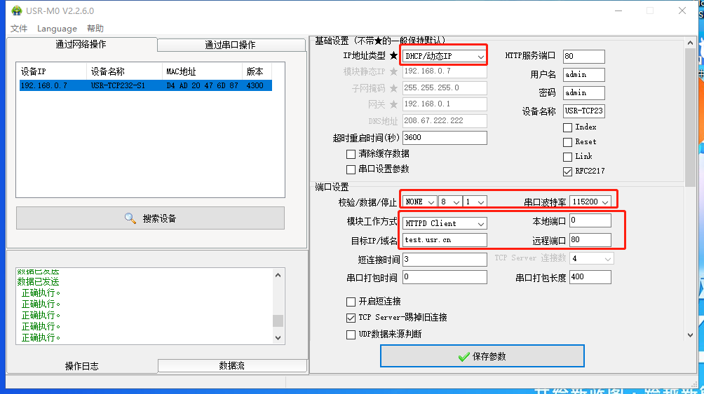 4.IP設(shè)置為DHCP,模塊設(shè)置為Httpd Client模式,請(qǐng)求方式GET,URL為/1.php?,設(shè)置服務(wù)器地址test.usr.cn,端口80,設(shè)置并保存所有參數(shù),重啟模塊。(本說明文檔使用為有人測(cè)試服務(wù)器)