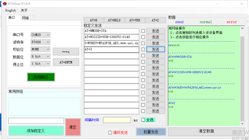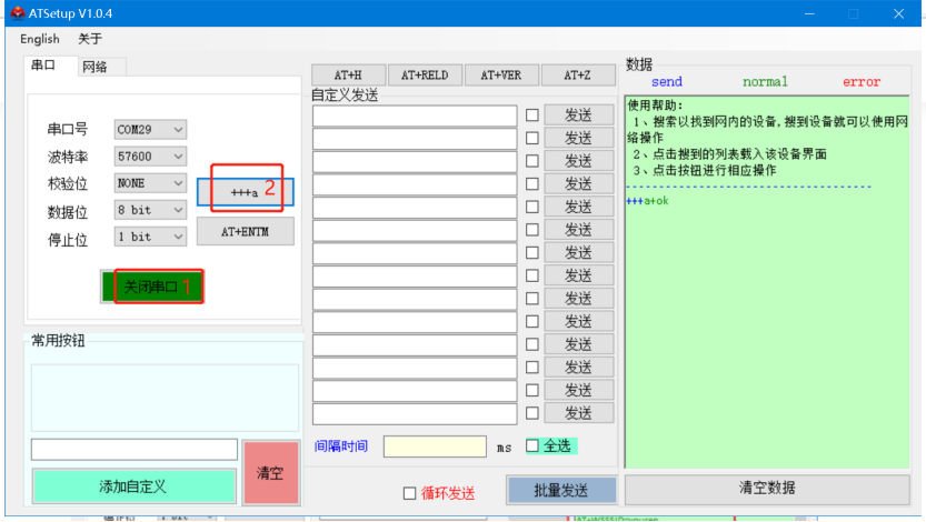 1、使用USB轉(zhuǎn)485的串口線,將設(shè)備與電腦進(jìn)行連接,在電腦的設(shè)備管理器中查看生成的端口號,關(guān)閉電腦的防火墻,下載并打開AT指令軟件,使用設(shè)備默認(rèn)的串口參數(shù)(115200 N 8 1)打開串口。發(fā)送+++a進(jìn)入配置狀態(tài)。