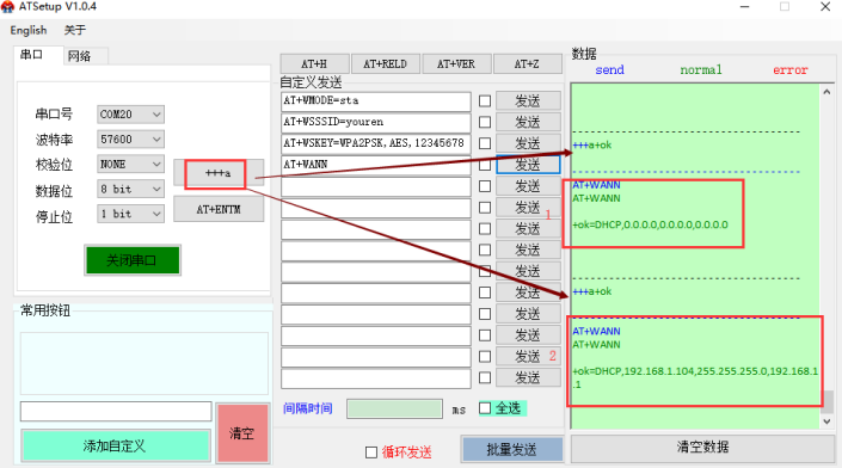 3、發(fā)送AT+Z重啟,點(diǎn)擊進(jìn)入配置狀態(tài),可以通過AT+WANN查詢路由器給設(shè)備分配的ip地址。