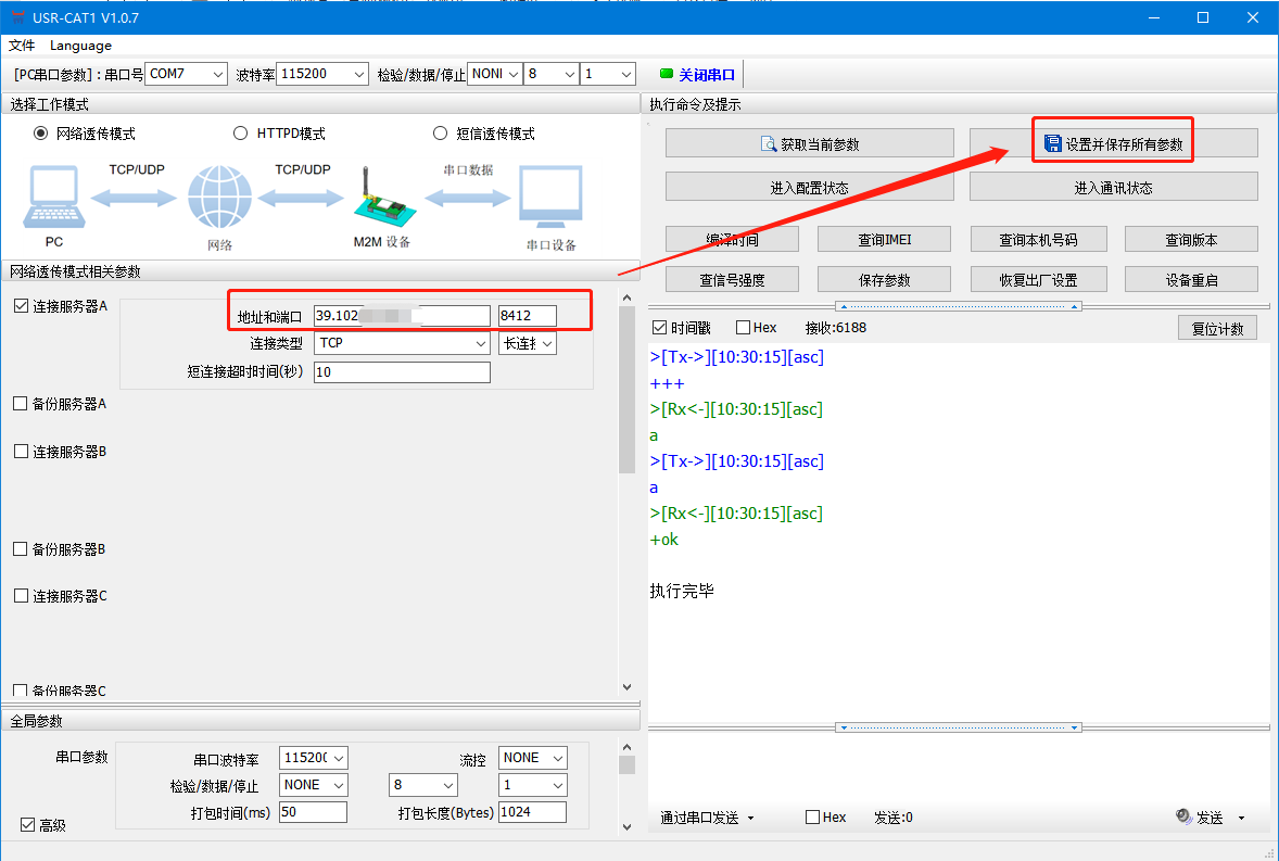 2>設(shè)置服務(wù)器A的地址和端口,修改參數(shù)后,設(shè)置并保存所有參數(shù),等待模塊重啟成功。