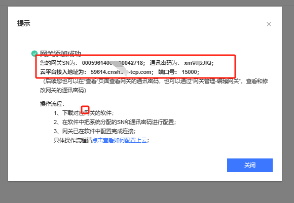設(shè)備名稱可自定義,所屬組織選擇根組織,T1目前不支持SN碼添加,點擊右側(cè)“沒有SN,點這里”,設(shè)備ID和通訊密碼可以自動生成,設(shè)備ID20位,通訊密碼必須是8位(支持修改密碼)。設(shè)置完成后點擊保存即可看到平臺給分配的接入地址和SN 密碼等信息。微信截圖_20240606090349-20240606090418.png)