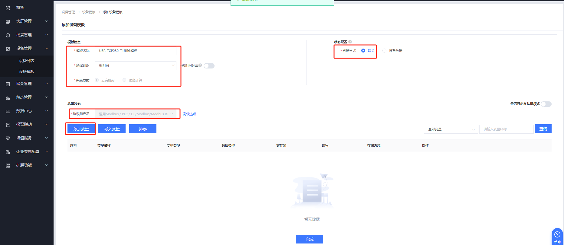 模板名稱可自定義,所屬組織選擇根組織,采集方式選擇云端輪詢,判斷方式選擇網(wǎng)關(guān)