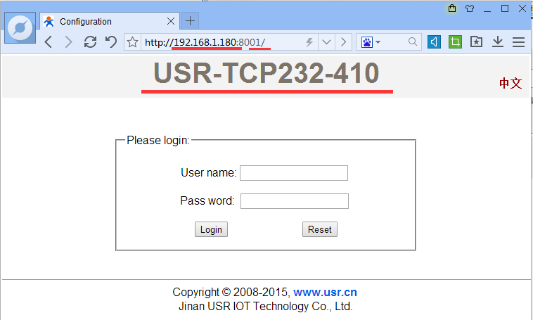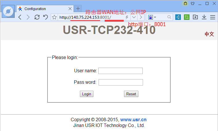 5:然后再外網(wǎng)登陸路由器的WAN口地址后綴:8001,在外網(wǎng)使用瀏覽器訪問串口服務(wù)器的網(wǎng)頁。