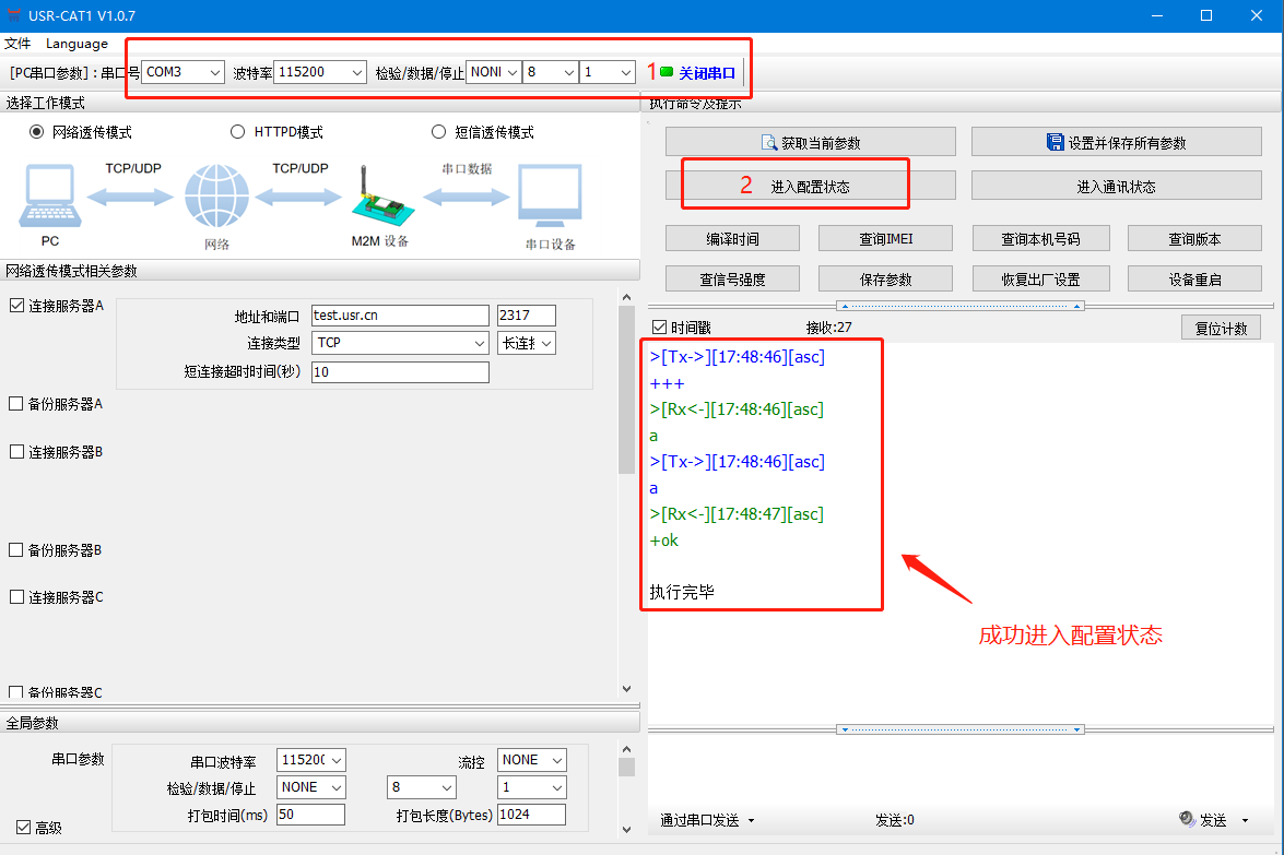 打開(kāi)串口后,先點(diǎn)擊進(jìn)入配置狀態(tài),如果模塊能返回+ok的字符,說(shuō)明電腦和模塊連接是沒(méi)有問(wèn)題的;然后點(diǎn)擊進(jìn)入通訊狀態(tài),做數(shù)據(jù)通訊測(cè)試。