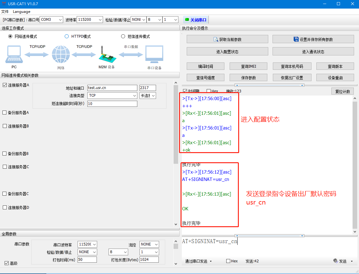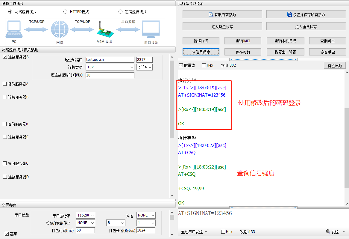 3.當(dāng)選擇開(kāi)啟安全機(jī)制,進(jìn)入配置狀態(tài)后,需要用戶先輸入正確密碼的登錄指令,才能進(jìn)行后續(xù)的操作,密碼正確即登錄設(shè)備,再次發(fā)送登錄指令為修改登錄密碼操作,如果登錄密碼不正確,將返回“+CME ERROR:73”,其他非登錄指令提示“please log in at