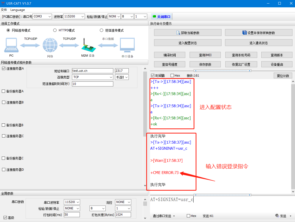 如果輸入登錄指令錯(cuò)誤會(huì)返回+CME ERROR:73如圖所示