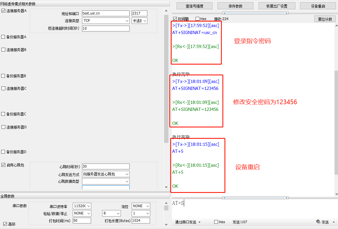 發(fā)送保存指令,發(fā)送之后模塊會(huì)自動(dòng)保存和重啟 AT+S