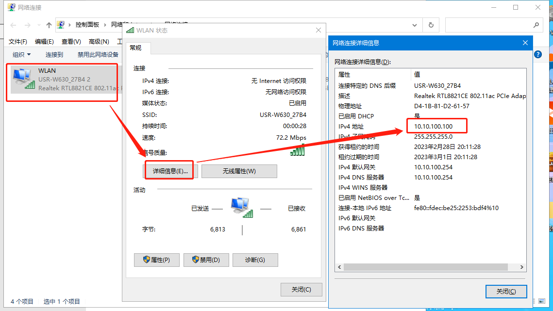 2、電腦連接W630的wifi,連接成功后,電腦會(huì)獲取到10.10.100.xx網(wǎng)段的IP地址