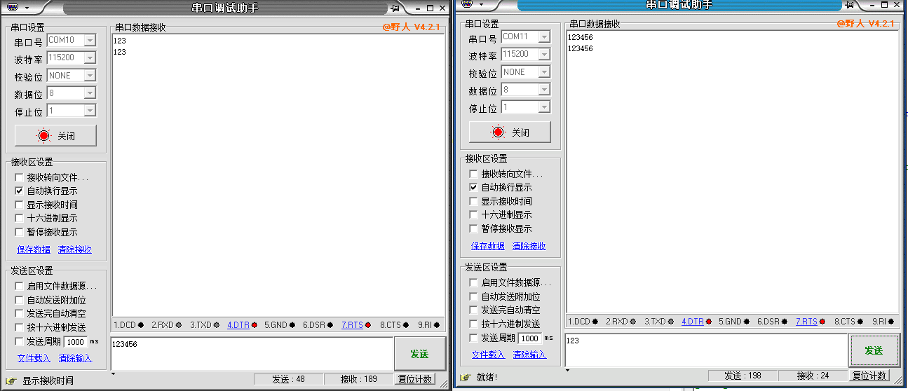 電腦打開2個(gè)串口調(diào)試助手軟件,打開兩個(gè)模塊對(duì)應(yīng)的USB-RS232/485串口線COM口號(hào),發(fā)送端模塊串口發(fā)送數(shù)據(jù)透?jìng)鹘o接收端所有的設(shè)備。