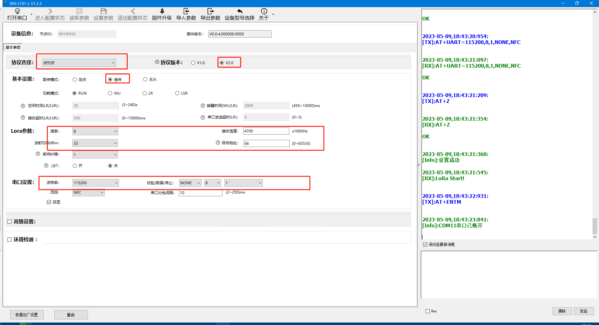 1、電腦下載并安裝WH-L101-L的設(shè)置軟件,選擇對(duì)應(yīng)的產(chǎn)品型號(hào)打開軟件。選擇對(duì)應(yīng)串口com10、com11,使用產(chǎn)品默認(rèn)的串口參數(shù)(115200 N 8 1)打開,點(diǎn)擊進(jìn)入配置狀態(tài)(返回a+ok說明成功進(jìn)入配置)然后讀取參數(shù)。
