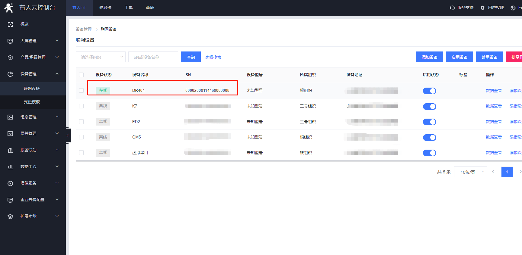 保存參數(shù)之后可以看到有人云DR404設(shè)備上線。