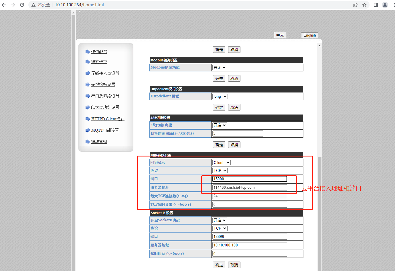 5、設(shè)置【串口及網(wǎng)絡(luò)設(shè)置】-網(wǎng)絡(luò)參數(shù)設(shè)置 TCP-client的工作模式,服務(wù)器地址和端口填寫云平臺接入地址和端口。保存不重啟設(shè)備,繼續(xù)配置。