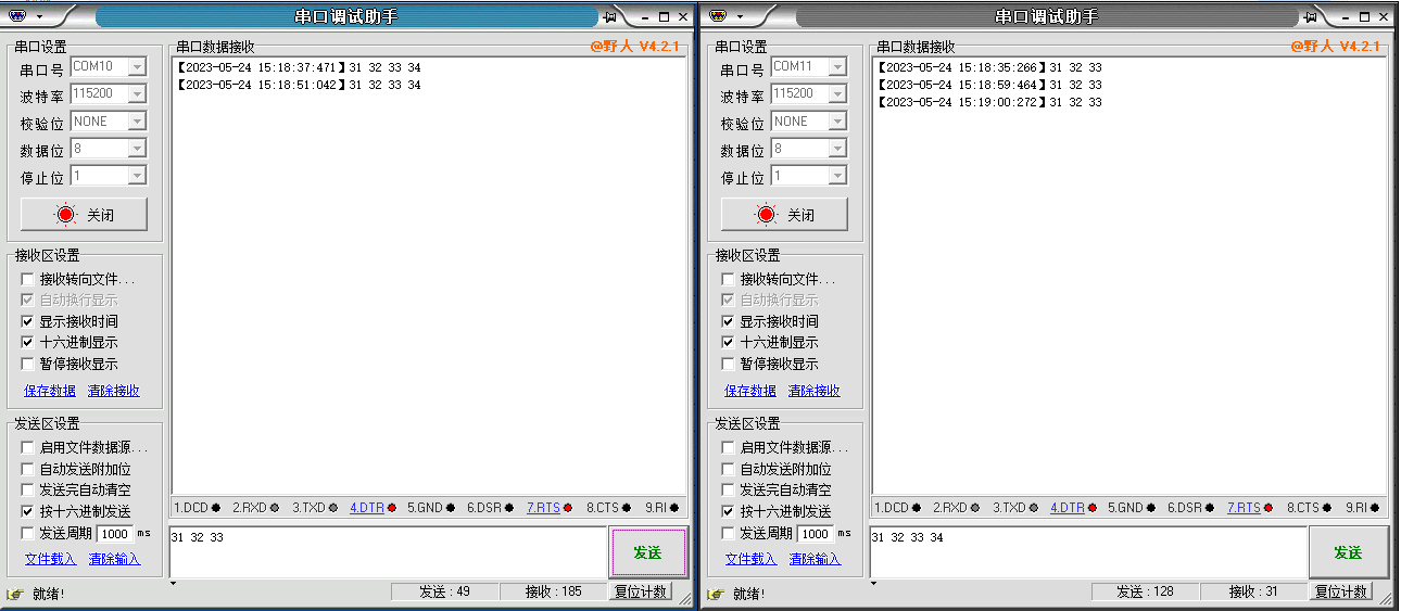 打開2個串口調(diào)試助手,分別打開發(fā)送端的com10( 115200 N 8 1) 和接收端的com11(115200 N 8 1),互相發(fā)送數(shù)據(jù)。