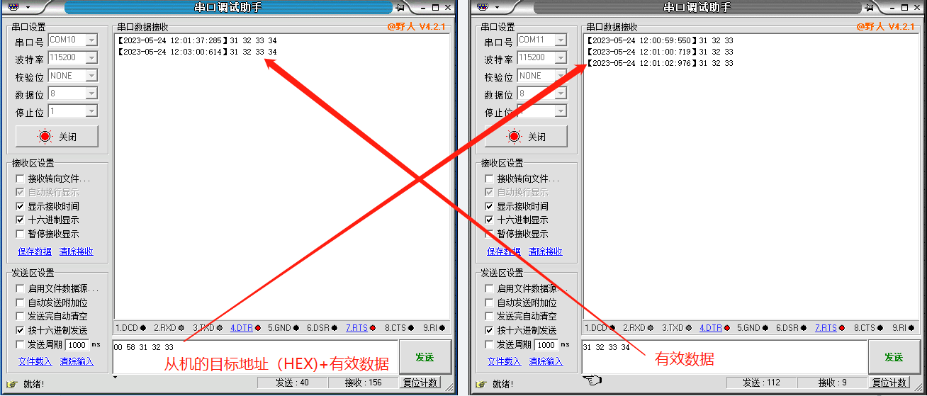 電腦打開2個串口調(diào)試助手軟件,打開兩個模塊對應(yīng)的USB-RS232/485串口線COM口號,主機端模塊串口發(fā)送16進制的數(shù)據(jù)(數(shù)據(jù)格式:從機端目標(biāo)地址(HEX)有效數(shù)據(jù)),有效數(shù)據(jù)透傳給接收端串口。從機端可以直接給主機端模塊發(fā)送有效數(shù)據(jù)。