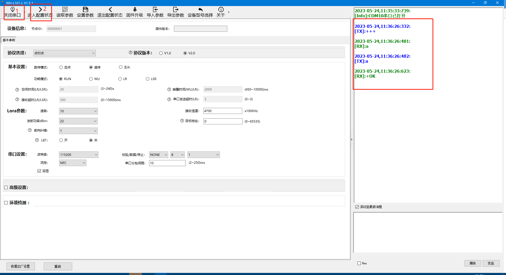 1、電腦下載并安裝WH-L101-L的設(shè)置軟件,選擇對應(yīng)的產(chǎn)品型號打開軟件。選擇對應(yīng)串口com10、com11,使用產(chǎn)品默認(rèn)的串口參數(shù)(115200 N 8 1)打開,點擊進入配置狀態(tài)(返回a+ok說明成功進入配置)然后讀取參數(shù)。