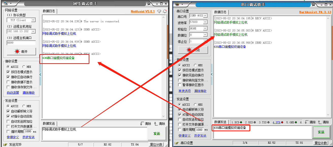 4、可以看到串口調(diào)試助手和網(wǎng)絡(luò)調(diào)試助手?jǐn)?shù)據(jù)是通訊的。