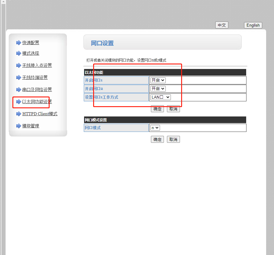 4、【以太網(wǎng)功能設(shè)置】配置 網(wǎng)口一和網(wǎng)口二都設(shè)置為 LAN 口 。
