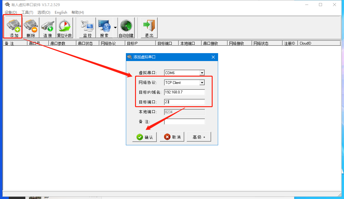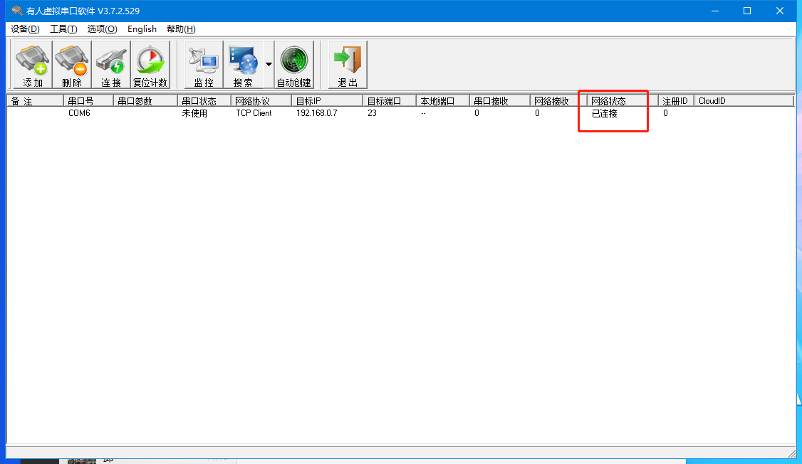 (1) 打開虛擬串口,設置點擊添加串口,選擇串口號為 COM6(選擇 COM 號一定要避開已經(jīng)存在的 COM 口) 網(wǎng)絡協(xié)議選擇 TCP Client,目標域名/IP 設置成T1的IP,目標端口號設置為 T1的端口號,備注填寫自己的設備名稱