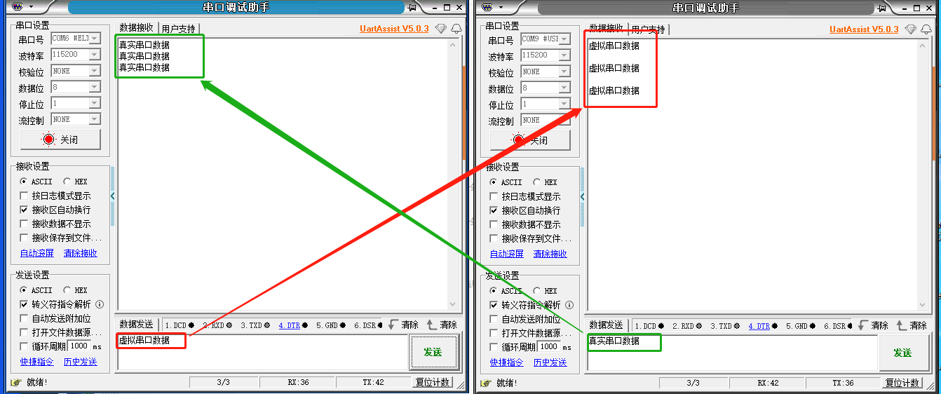 測試兩個串口之間的數(shù)據(jù)傳輸,就是T1真實串口和虛擬串口之間的數(shù)據(jù)傳輸。