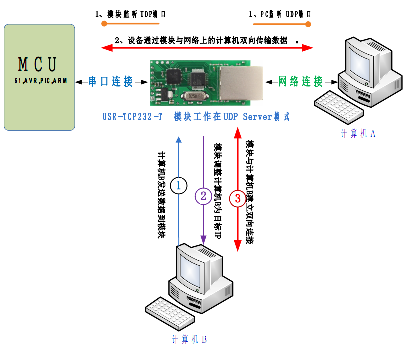 在此模式下,模塊默認記錄一個目標IP,當串口有數(shù)據(jù)時,向記錄的IP發(fā)送數(shù)據(jù),同時,模塊處于服務(wù)器的地位,接收網(wǎng)絡(luò)中發(fā)給模塊的數(shù)據(jù)包,并隨時調(diào)整目標IP為數(shù)據(jù)來源的IP,適合于多個IP對應(yīng)模塊的工作方式。使用計算機端的程序和UDP模式完全一樣,不需要任何更改。