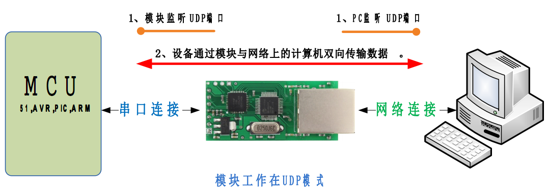 UDP client ,是指模塊通電后監(jiān)聽設(shè)置的端口,不主動建立鏈接,當串口設(shè)備向模塊串口發(fā)送數(shù)據(jù)時,串口服務(wù)器 將數(shù)據(jù)發(fā)送到設(shè)定的目標IP和端口上,PC端可以將目標IP和端口設(shè)置為模塊的自身IP模塊的自身端口,然后PC端發(fā)送數(shù)據(jù),可以將數(shù)據(jù)發(fā)送到模塊的串口端。