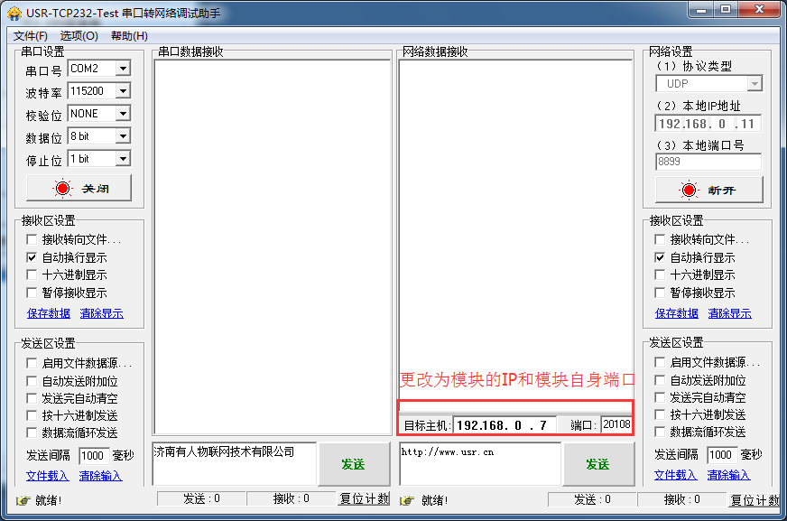 1:設(shè)置參數(shù):把目標IP改成電腦的IP:192.168.0.11.連接目標端口請看以下TCP232-TEST軟件設(shè)置的本地端口號:22222