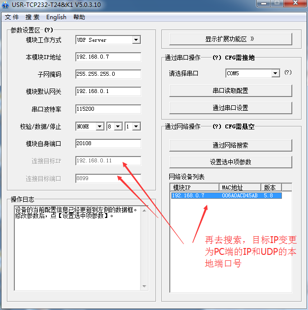 5:為了檢驗此功能,雙向發(fā)送數(shù)據(jù)測試成功以后,使用設(shè)置軟件搜索,然后查詢參數(shù),發(fā)現(xiàn)目標IP和端口改成了192.168.0.11和8899