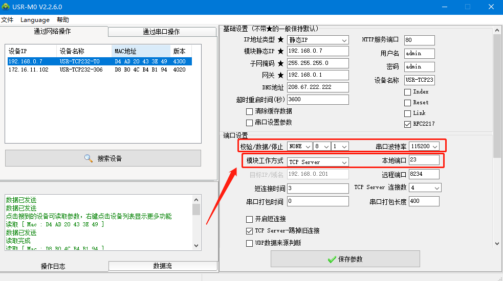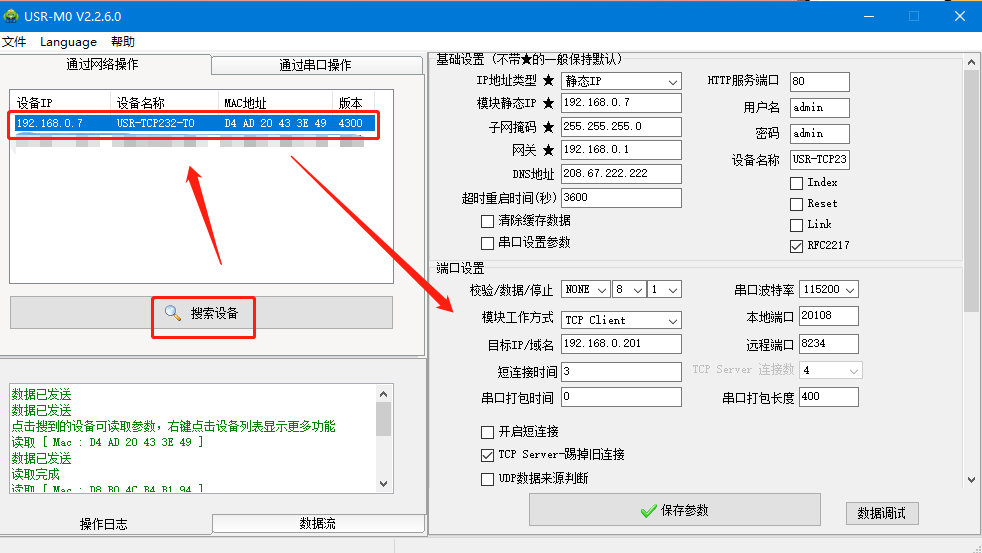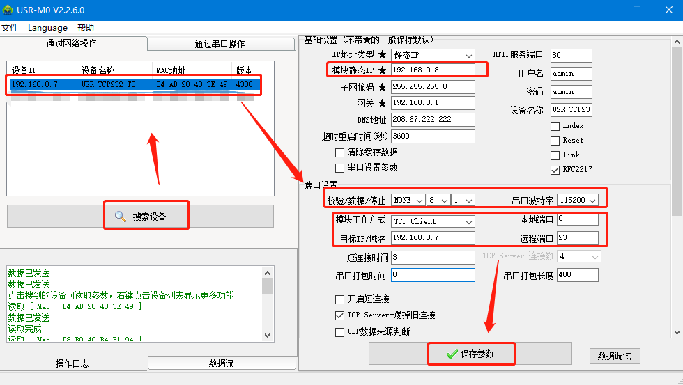 用M0設(shè)置軟件搜索設(shè)備,獲取T0 的IP參數(shù),點(diǎn)擊T0的IP,將T0的IP設(shè)置192.168.0.8,工作方式TCP client,本地端口 0,遠(yuǎn)程端口23,目標(biāo)IP 192.168.0.7,點(diǎn)擊保存參數(shù)