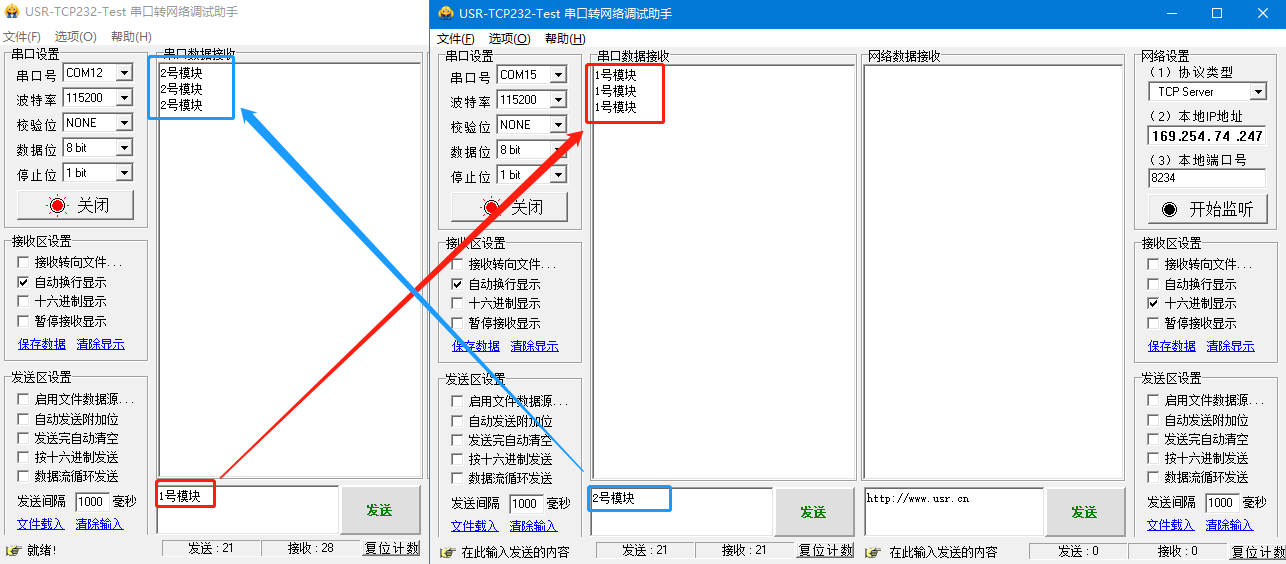 電腦用串口助手打開2個(gè)T0的COM口,用對(duì)應(yīng)T0的串口參數(shù),然后進(jìn)行數(shù)據(jù)傳輸。
