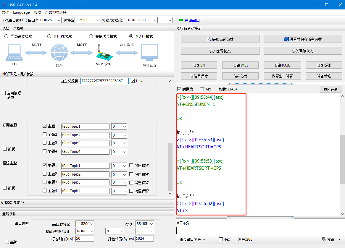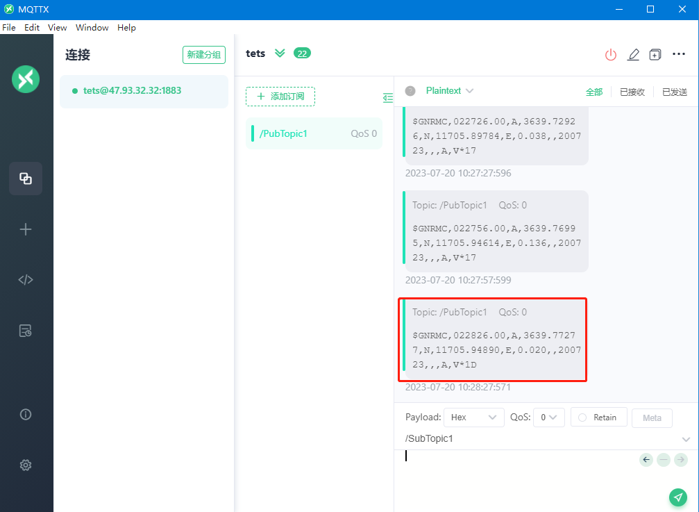 設(shè)備鏈接GPS天線可以防在室內(nèi)空曠位置,在MQTT.X查看定位數(shù)據(jù)