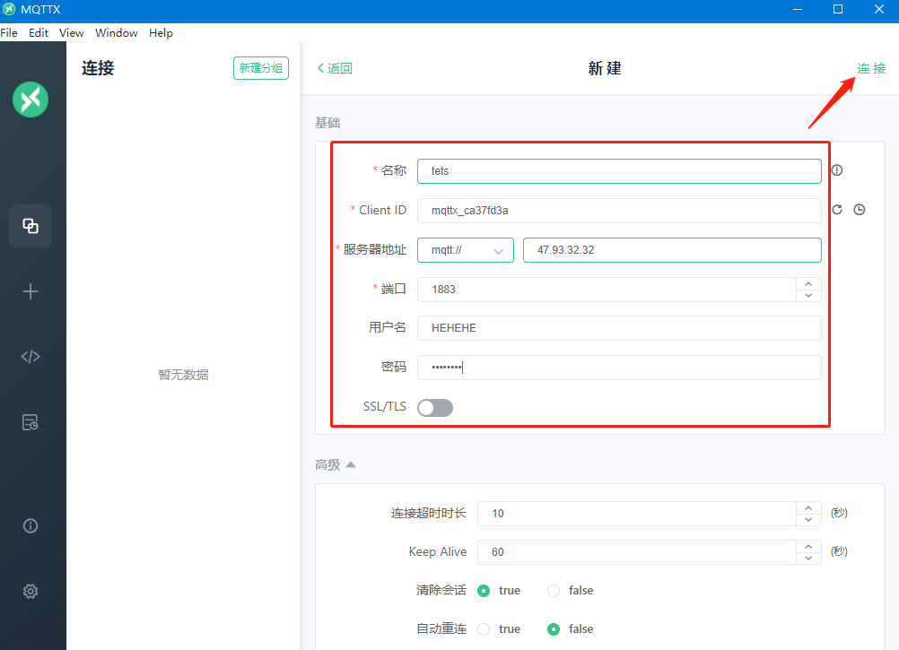 3.打開(kāi)MQTT cleint軟件:MQTT.X,點(diǎn)擊新建一個(gè)客戶端,填寫(xiě)好MQTT服務(wù)器參數(shù)后點(diǎn)擊"Connect”