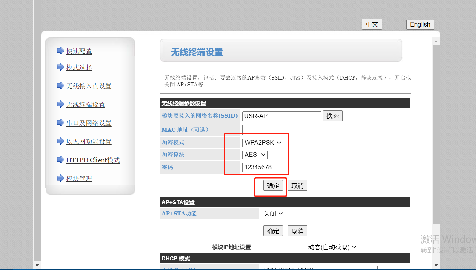 5.之后會(huì)提醒您輸入密碼,輸入密碼以后點(diǎn)擊確定;如果需要給模塊設(shè)置固定IP,請(qǐng)?jiān)谙旅娴摹癉HCP自動(dòng)獲取參數(shù)”選項(xiàng)中設(shè)置,設(shè)置完成后同樣需要點(diǎn)擊確定。