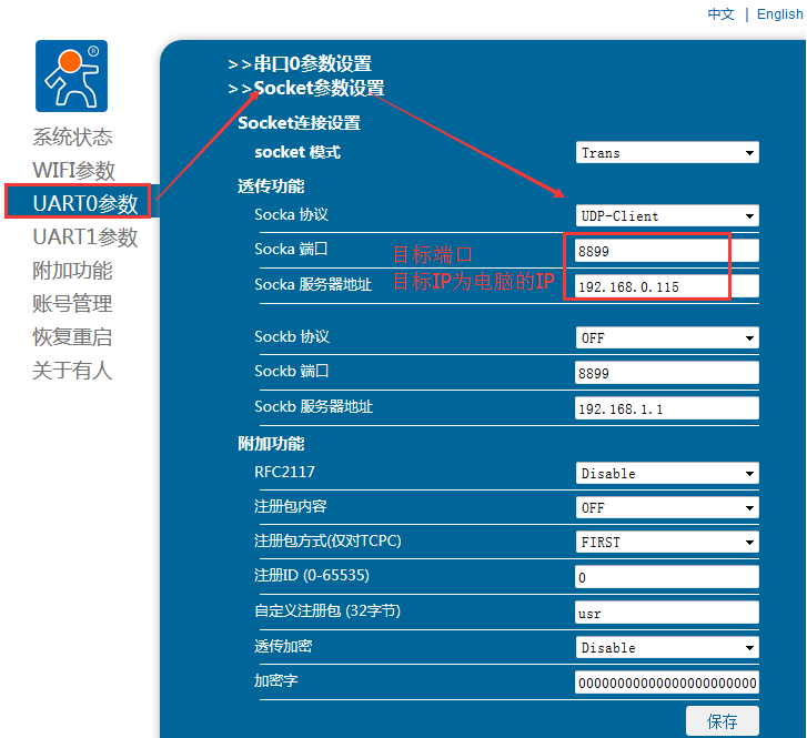 1:進(jìn)入配置網(wǎng)頁(yè),設(shè)置socka協(xié)議為UDP server,UDP server端口8899 。socka服務(wù)器地址可以設(shè)置為電腦的IP,這個(gè)服務(wù)器地址是代表WiFi模塊串口接收到數(shù)據(jù)后,將數(shù)據(jù)發(fā)送到網(wǎng)絡(luò)端,如果模塊沒(méi)有記錄來(lái)源IP和端口的話,模塊自動(dòng)將數(shù)據(jù)發(fā)送到服務(wù)器地址和socka端口。設(shè)置完成后重啟WiFi模塊